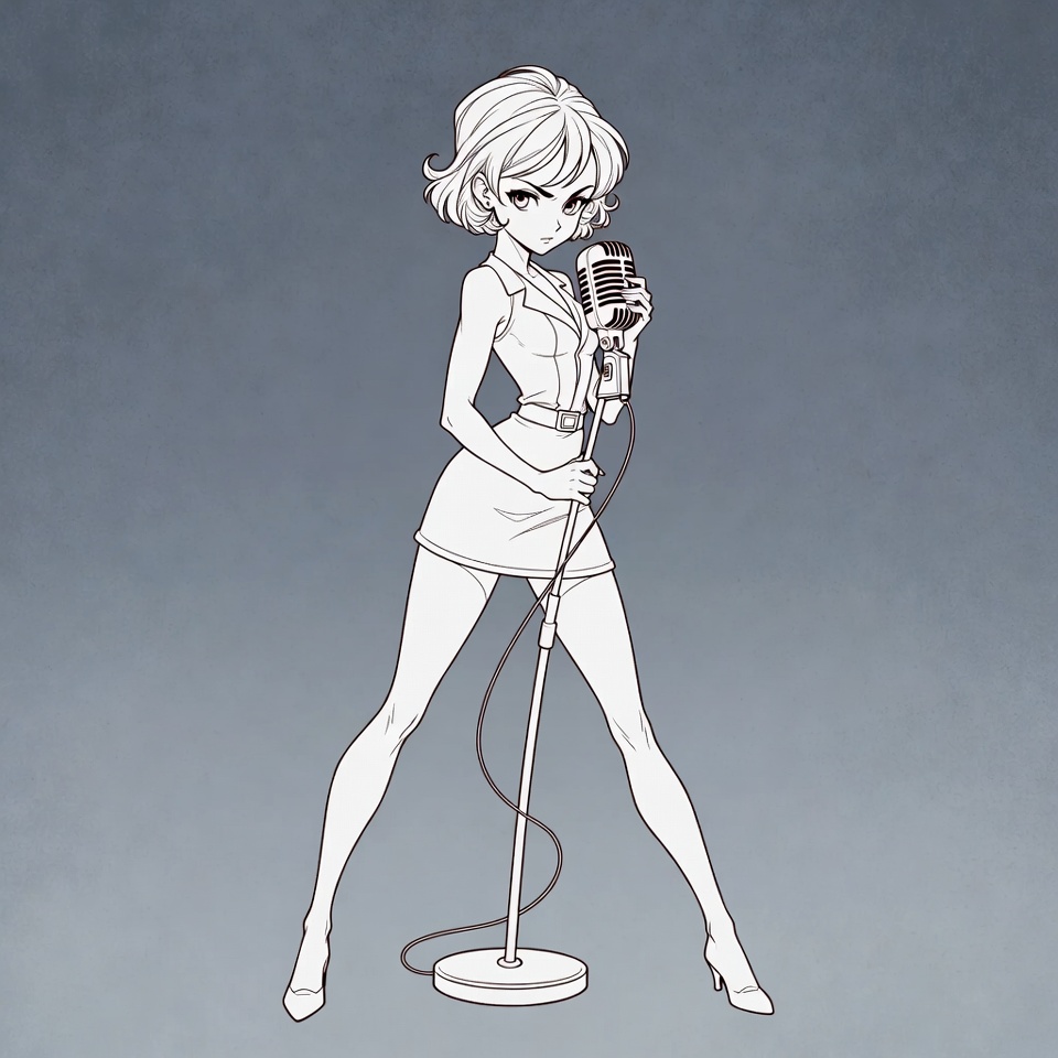A line art anime girl with short blonde hair and sharp eyes holds a microphone while standing confidently at a stand. She wears a short-sleeved white blouse tucked into a tight mini skirt with a belt, paired with high heels. Her legs are spread apart in a dynamic singing pose on a plain gray background.