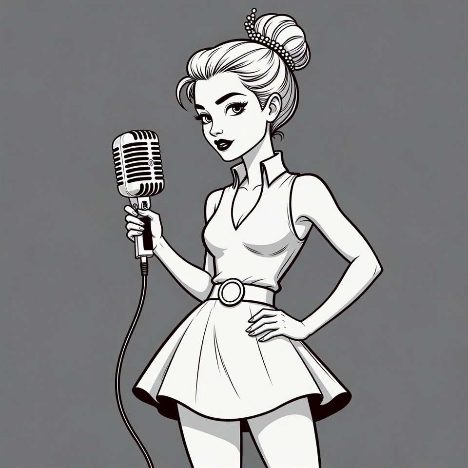 belt, bun hairstyle, cartoon, collared dress, confident, drawing, dress, female, flared skirt, gray background, illustration, line art, microphone, pearl tiara, performer, retro mic, singing, sleeveless top, stage, standing pose, vintage microphone, white dress, woman