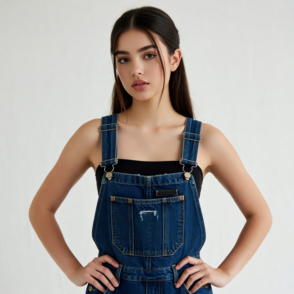 A young Asian woman with long dark hair pulled into a ponytail stands confidently against a white background. She wears blue denim overalls over a black tube top, with hands on hips in a poised pose. Her expression is neutral with subtle makeup accentuating her features.