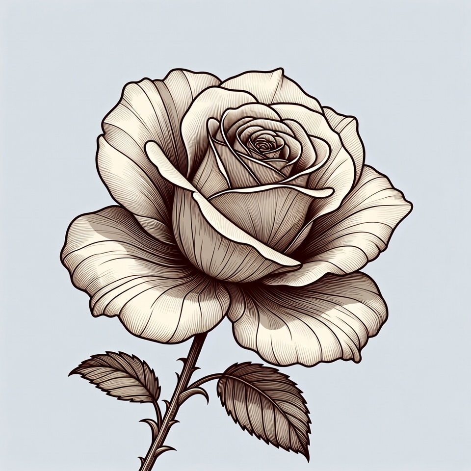 beige tones, botanical, clipart, detailed, engraving style, floral, flower, illustration, ink drawing, isolated background, leaves, line art, monochrome rose, petals, sketch, stem, tattoo design, thorns, vector art, rose