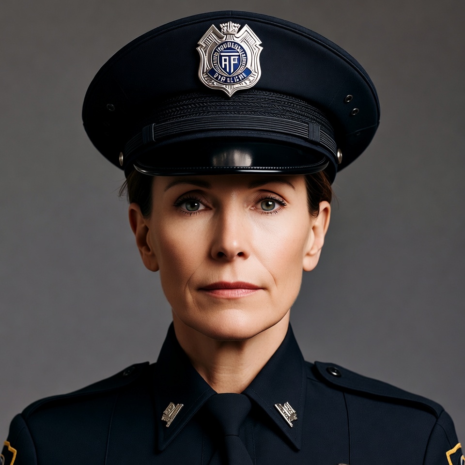 A woman with short brown hair wears a dark blue police uniform and peaked cap with badges. She stands against a gray background, facing forward with a serious expression. Her uniform includes a tie, epaulets, and shoulder patches.