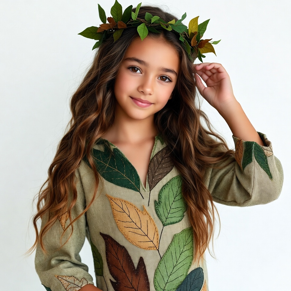 A young girl with long wavy brown hair smiles while wearing a large wreath of green and brown leaves on her head. She has on a green dress adorned with embroidered multicolored leaves and poses with one hand touching her head. The image is set against a plain white background.