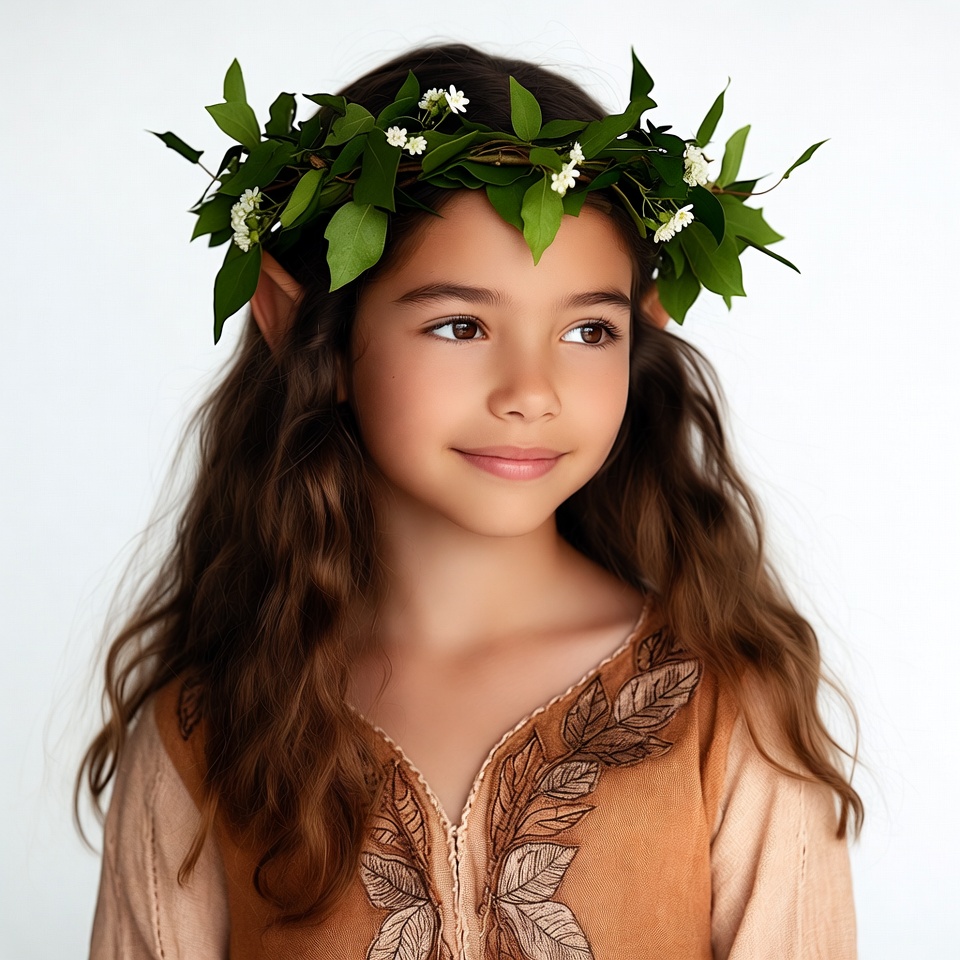 Multiracial, brown hair, child, cute girl, elf ears, fantasy girl, flower crown, green leaves, isolated background, leaf embroidery, leafy crown, nature crown, orange tunic, portrait, smiling, wavy hair, white flowers, young girl, girl