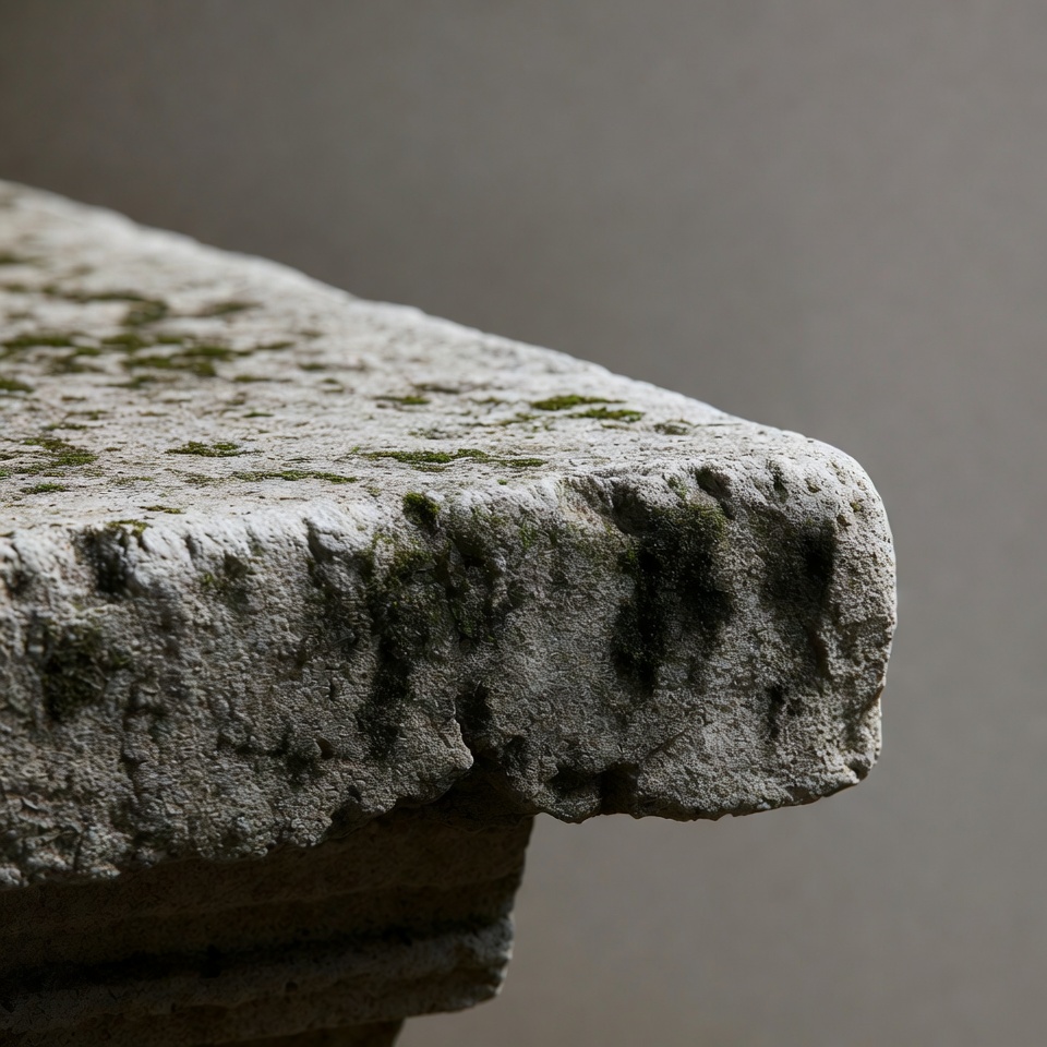 ancient stone, blurred background, close-up, detail, edge, gray stone, green moss, lichen, macro, moss, moss growth, mossy surface, natural, outdoor, patina, rough texture, stone slab, table edge, texture, weathered stone, stone