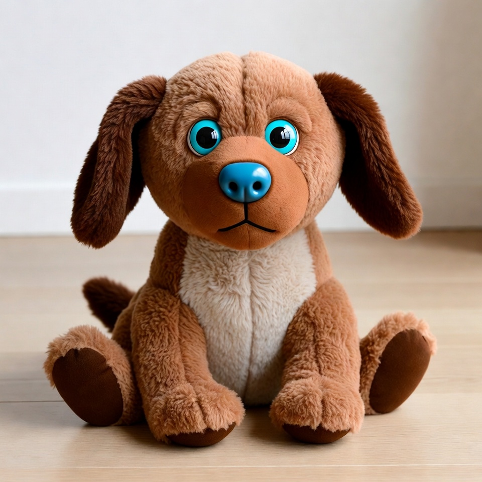 adorable toy, blue eyes, blue nose, brown fur, cartoon dog, cute puppy, dog plushie, floppy ears, fluffy dog, isolated background, pet toy, puppy, sitting dog, stuffed animal, toy dog, white chest, plush dog