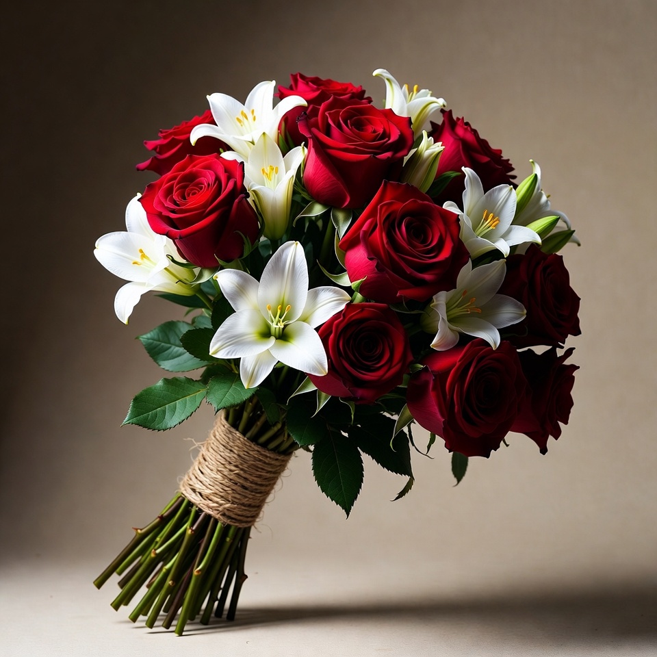 A beautiful bouquet features vibrant red roses and elegant white lilies tied with twine. The stems are wrapped in brown string and lean slightly to one side against a neutral background. Fresh green leaves accent the flowers.