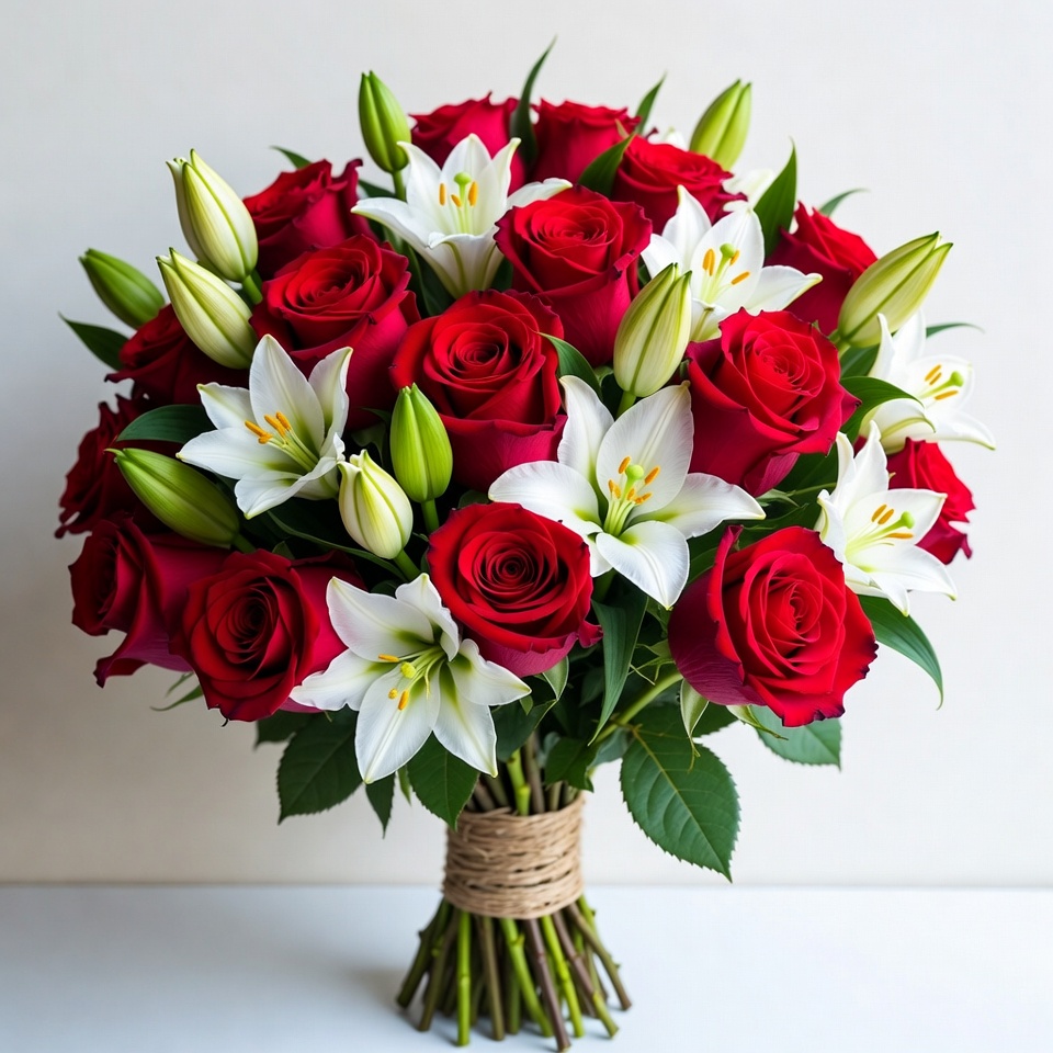 A beautiful bouquet features vibrant red roses and elegant white lilies tied with twine. The stems are wrapped in brown string and placed against a plain white background. Green leaves and buds add contrast to the floral arrangement.