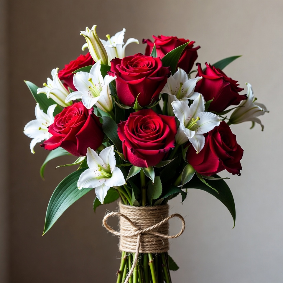 A beautiful bouquet features vibrant red roses and elegant white lilies tied with twine. The flowers are arranged tightly together with green leaves and stems visible at the base. It is presented against a neutral beige background.