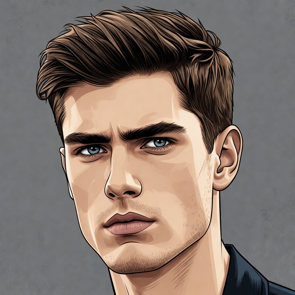 White, attractive male, blue eyes, brown hair, defined jawline, digital illustration, face closeup, gray background, handsome man, illustration, male, male portrait, man, portrait, serious expression, short hair, vector art, young man