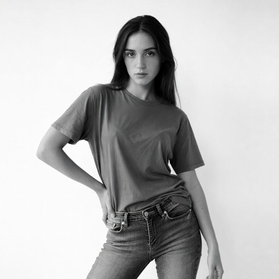 A young woman with long dark hair stands posing against a white background in a black and white photo. She wears a loose gray t-shirt and fitted jeans with hands on hips. Her expression is neutral with direct gaze at the camera.