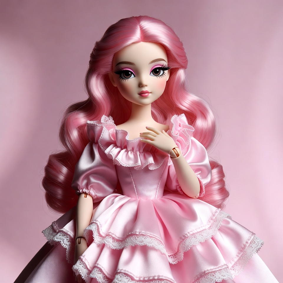 A detailed doll with long wavy pink hair poses gracefully against a pink background. She wears an elaborate pink satin dress with ruffled sleeves, layered skirts, and lace trims. Her large expressive eyes and delicate hands add to the intricate design.