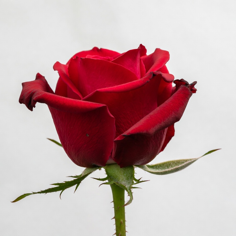 bloom, close-up, floral, flower, green leaves, isolated, macro photography, nature, red flower, rose bud, rose flower, rose petals, rose stem, single rose, thorns, vibrant red, white background, red rose