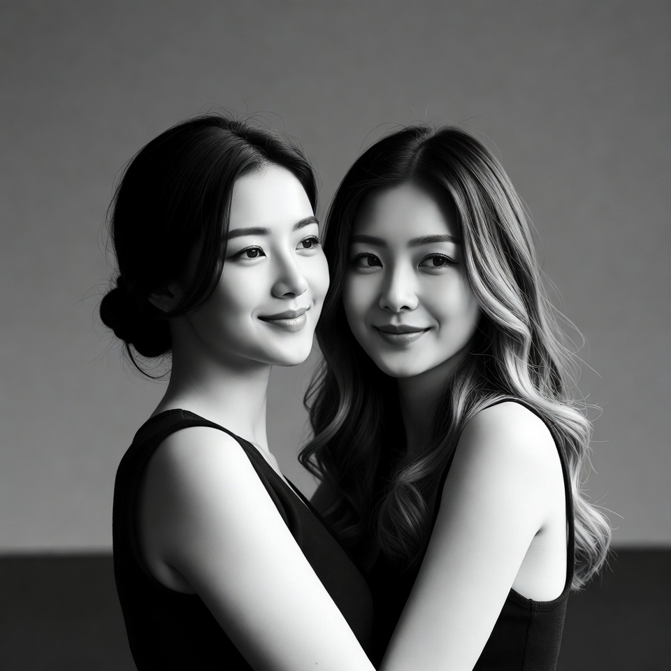 Two young Asian women with long dark hair stand closely together in a black and white portrait. The woman on the left has her hair in a bun and wears a sleeveless top, while the one on the right has wavy highlighted hair. Both smile softly at the camera against a plain gray background.