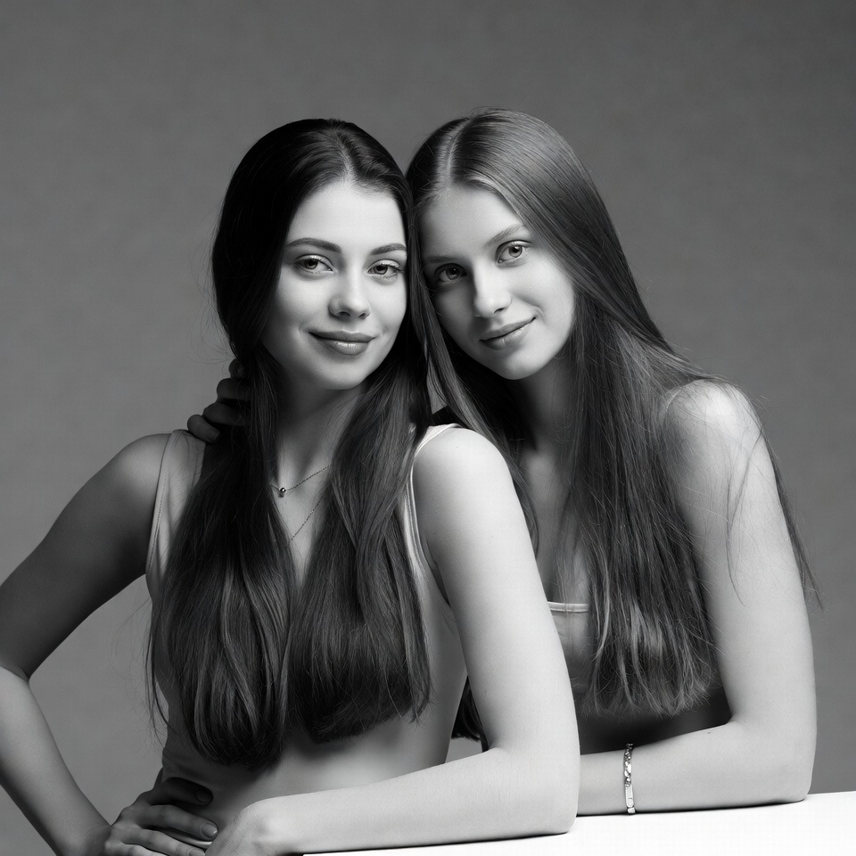 A black and white portrait shows two young women with long dark hair standing close together. They wear tank tops and necklaces, smiling softly at the camera with arms around each other. They pose against a plain gray background.