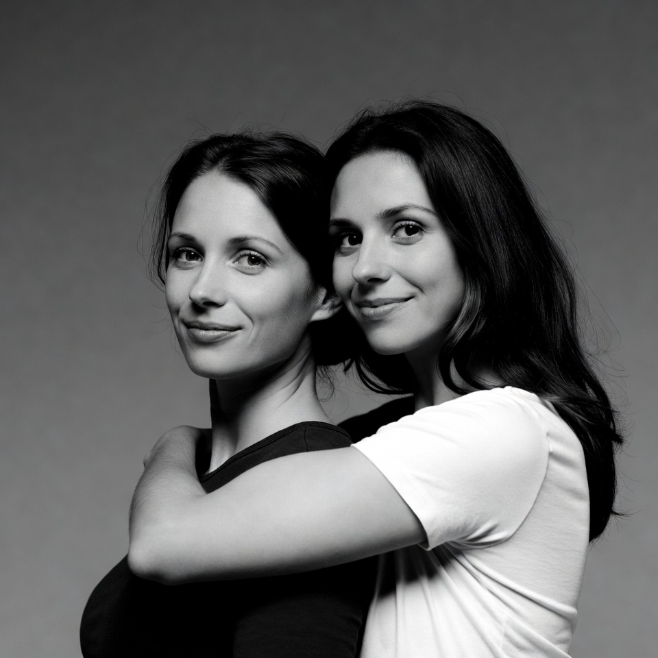 A black and white portrait shows two women with dark hair smiling and embracing each other closely. The woman on the left wears a black top, while the one on the right wears a white t-shirt. They stand against a plain gray background with their faces close together.
