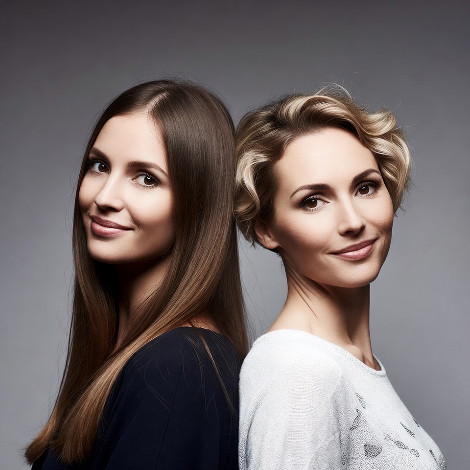 Two women with different hairstyles stand side by side against a gray background. The woman on the left has long straight brown hair and wears a dark top, while the woman on the right has short curly blonde hair and a white top. Both have subtle smiles and fair skin.