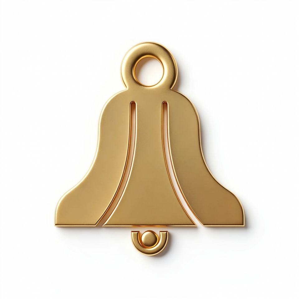 A shiny 3D golden bell icon hangs from a loop at the top. It features a classic bell shape with flared base and clapper at the bottom. The object is isolated on a white background.