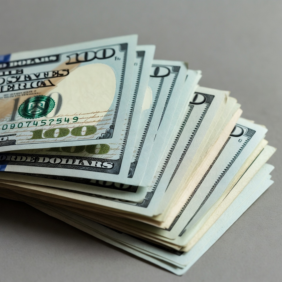A neat stack of crisp U.S. 100 dollar bills sits on a plain gray surface. The bills feature Benjamin Franklin's portrait and green security strips. They are fanned slightly to show multiple denominations clearly.