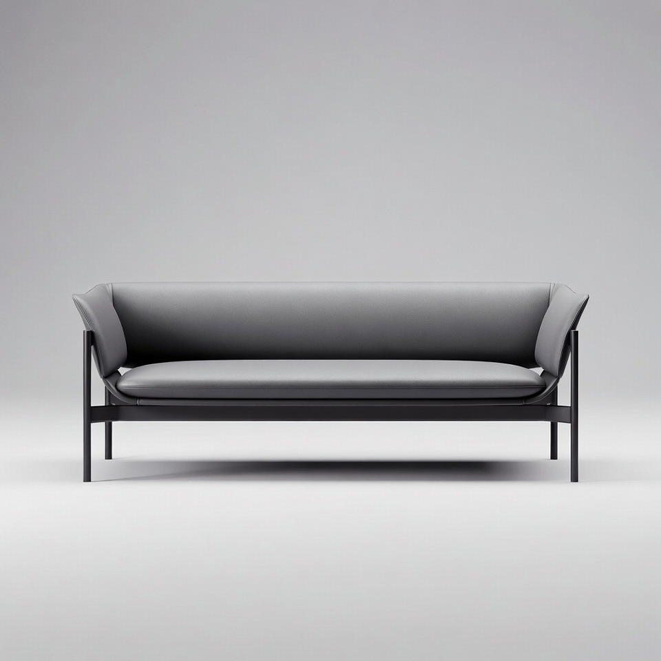 3D render, black frame, couch, curved arms, furniture, gray sofa, interior design, isolated background, living room furniture, metal legs, minimalist sofa, modern sofa, plush cushions, upholstered sofa, sofa