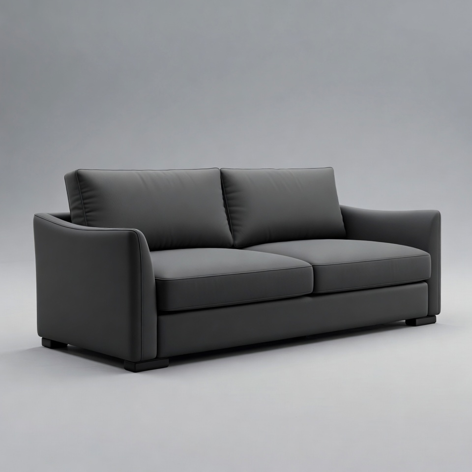 contemporary furniture, couch, curved arms, furniture, gray sofa, home decor, isolated background, leather sofa, living room, modern sofa, plush cushions, two-seater, upholstery, wooden legs, sofa