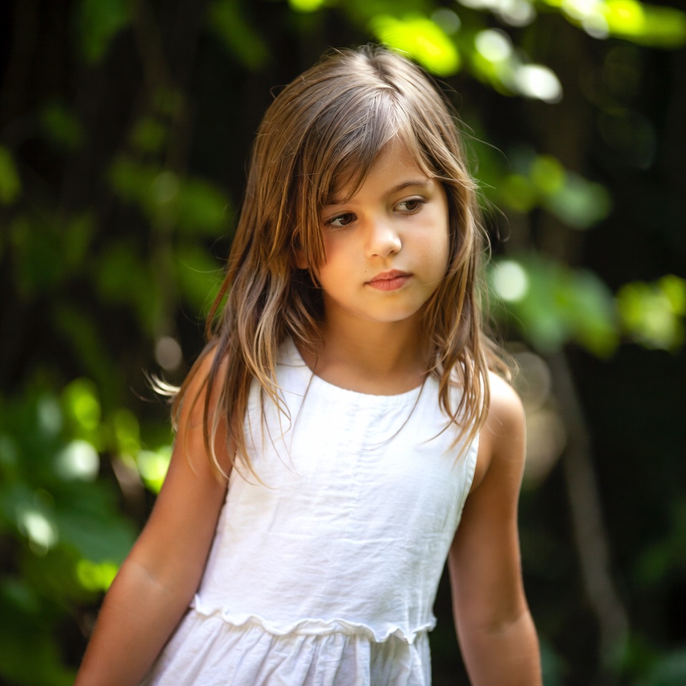 White, bangs, brown hair, child, female, forest, green foliage, lush greenery, nature, outdoors, portrait, ruffled dress, sleeveless dress, standing, sunlight, white dress, young girl, girl