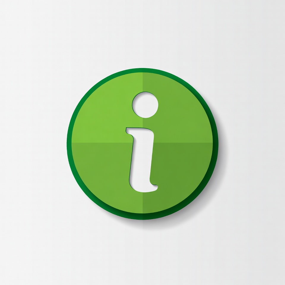 A green circular button features a large white lowercase 'i' in the center. The design uses a flat style with subtle cutout effects on a white background. It is isolated and suitable for UI elements.