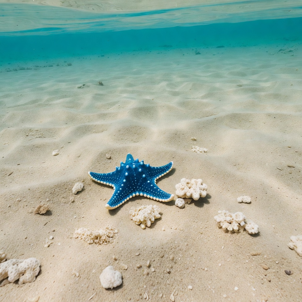 beach sand, blue sea, blue starfish, clear water, coral, marine life, ocean, ocean animal, ocean floor, sand, sea bottom, sea creature, sea star, seabed, starfish closeup, tropical sea, turquoise water, underwater, white coral, starfish