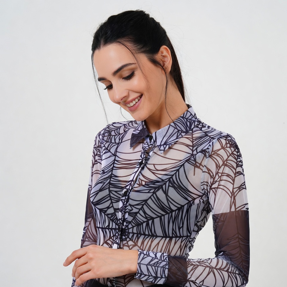 A young woman with long dark hair tied in a ponytail smiles while tilting her head. She wears a sheer black collared shirt with intricate white spiderweb patterns and long sleeves. She stands against a plain white background with her hands clasped together.