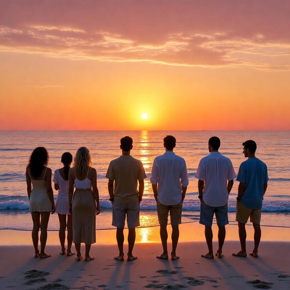 Six people, including women and men, stand barefoot on a sandy beach facing the ocean at sunset. They wear light summer clothing like dresses and shirts, silhouetted against the vibrant orange and pink sky. The sun hovers low over the calm sea waves.