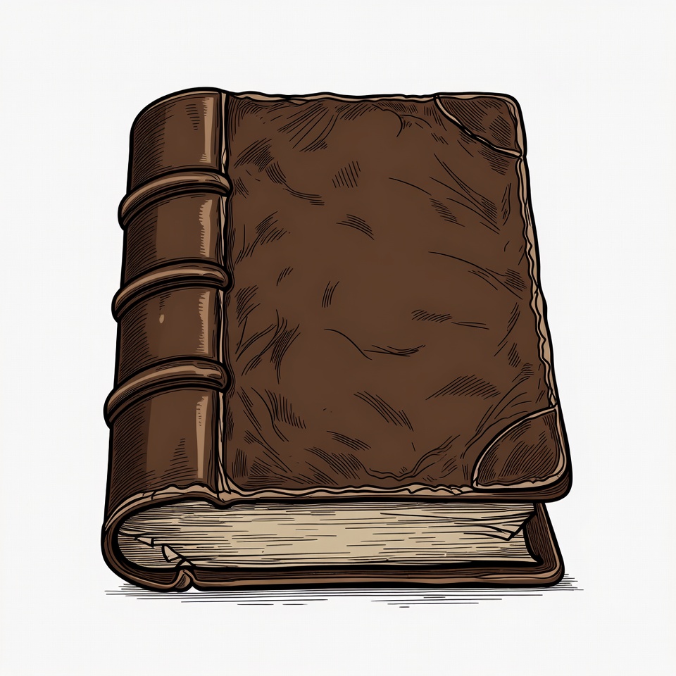 A hand-drawn illustration of an old brown leather-bound book with the front cover open. The book features worn edges, four raised spine bands, and slightly visible white pages inside. It is depicted on a white isolated background.