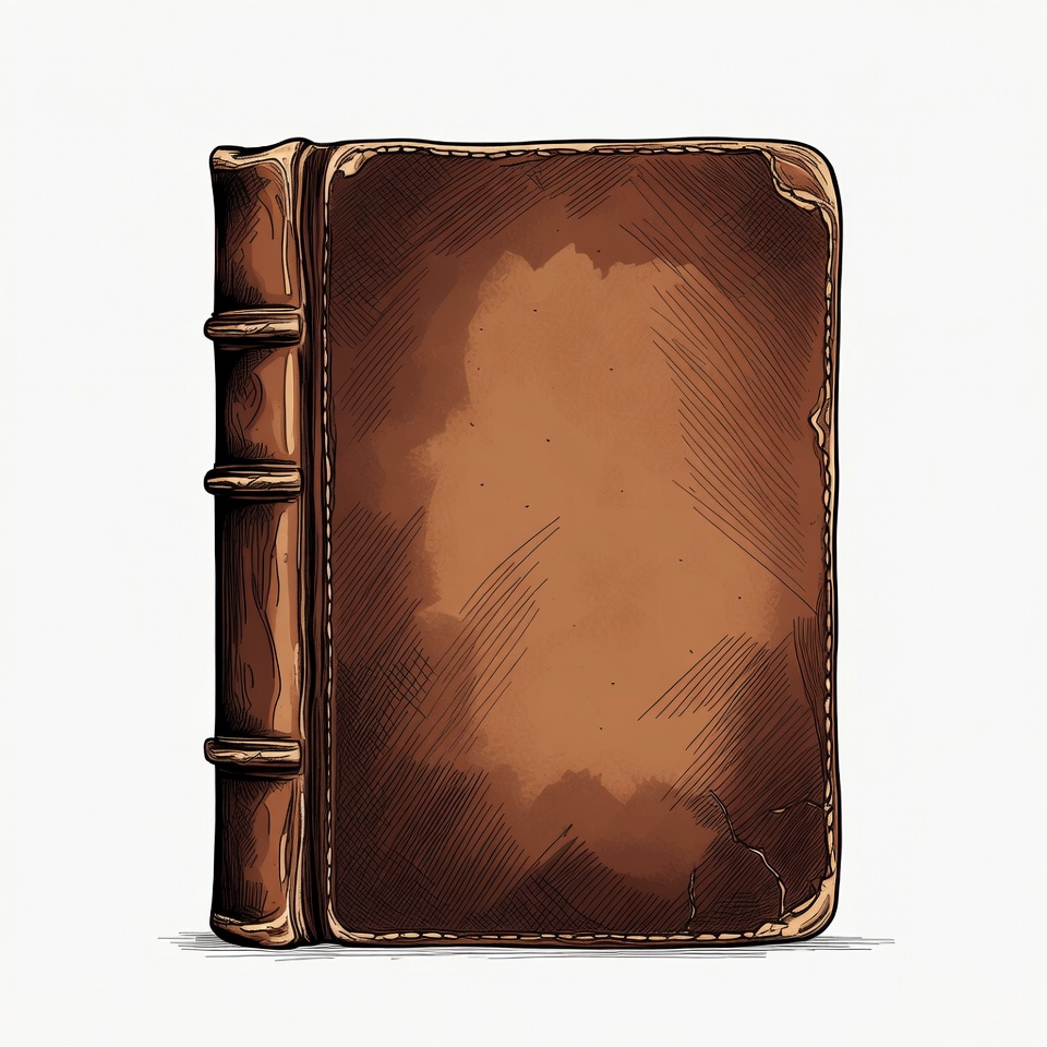 A hand-drawn illustration of an old leather-bound book with a worn brown cover. The book features detailed spine ridges and subtle cracks on the surface. It is depicted on a white isolated background.