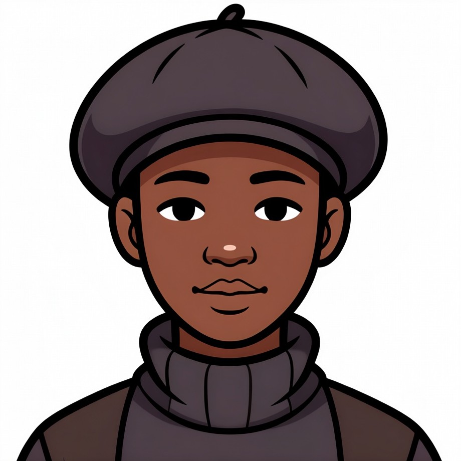 African-American, avatar, beret, brown skin, cartoon, clipart, clothing, dark clothing, fashion, friendly expression, headshot, illustration, isolated background, male, portrait, purple hat, smiling face, stylish, sweater, turtleneck, young boy, boy