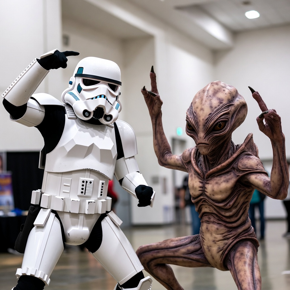 Star Wars, alien, blurred crowd, brown alien, claws, convention, cosplay, costume, dynamic pose, elongated head, event, extraterrestrial, fandom, female, futuristic, gesture, hall, helmet, impersonator, indoor, male, pointing pose, sci-fi, white armor, Stormtrooper