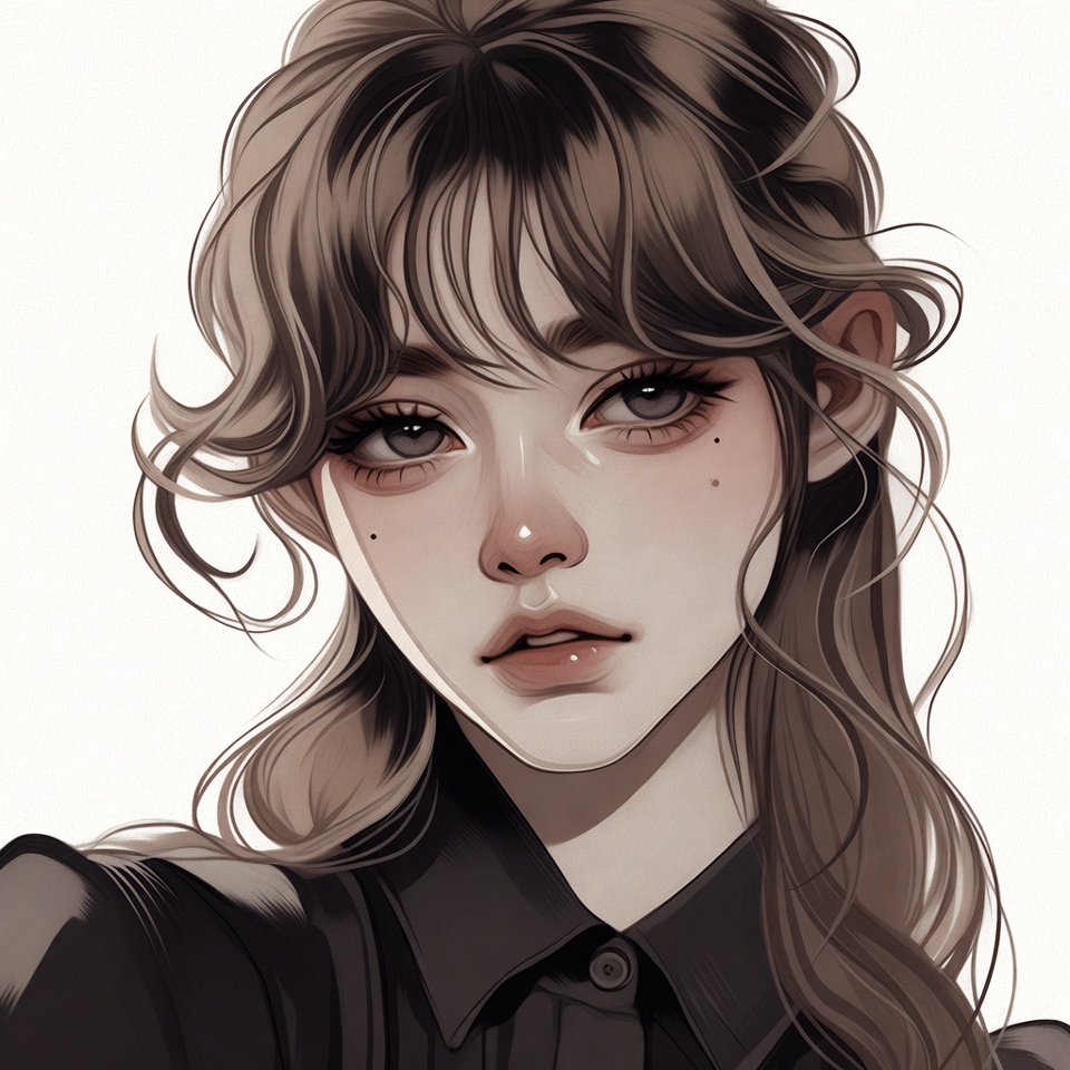 Asian woman, bangs, black collar, brown hair, closeup, collared shirt, detailed drawing, digital art, female, flushed cheeks, glossy lips, illustration, large eyes, makeup, portrait, soft lighting, stylized face, wavy hair, young woman, anime girl