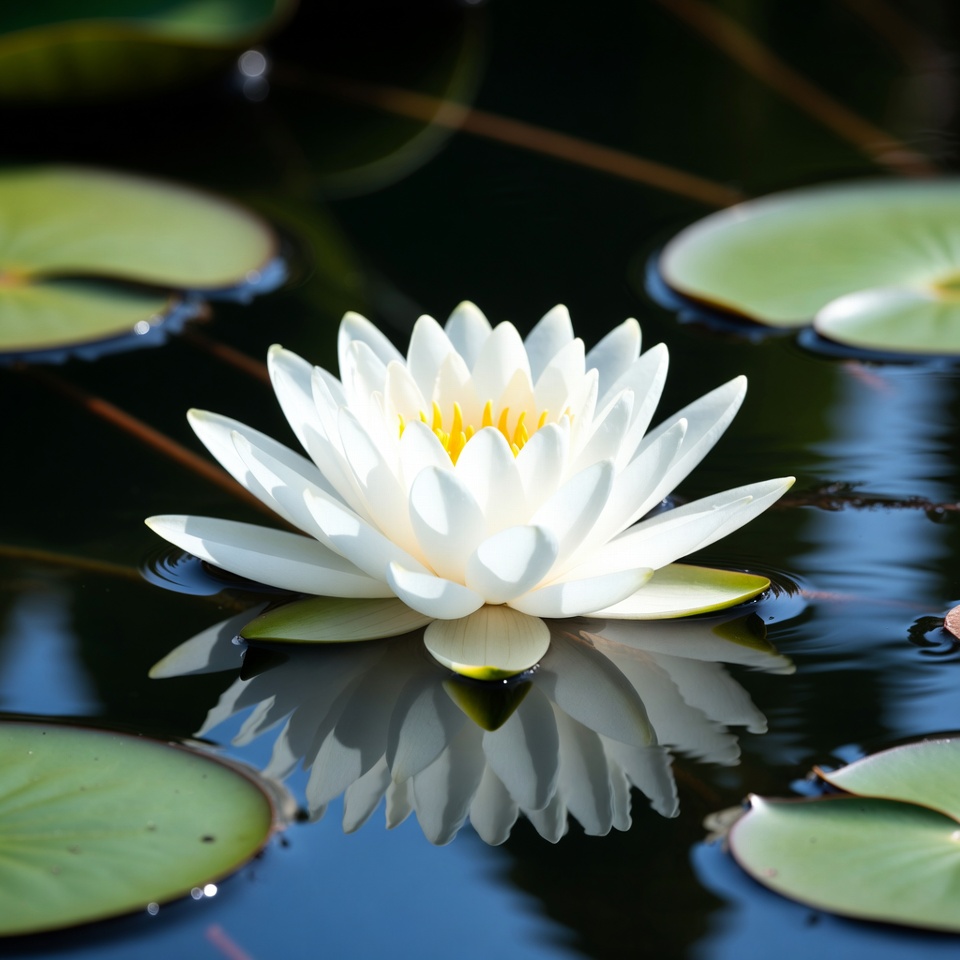 A vibrant white lotus flower with yellow center blooms in the center of dark blue water surrounded by green lily pads. Its reflection is clearly visible in the rippling water below. The flower stands prominently among the floating pads.