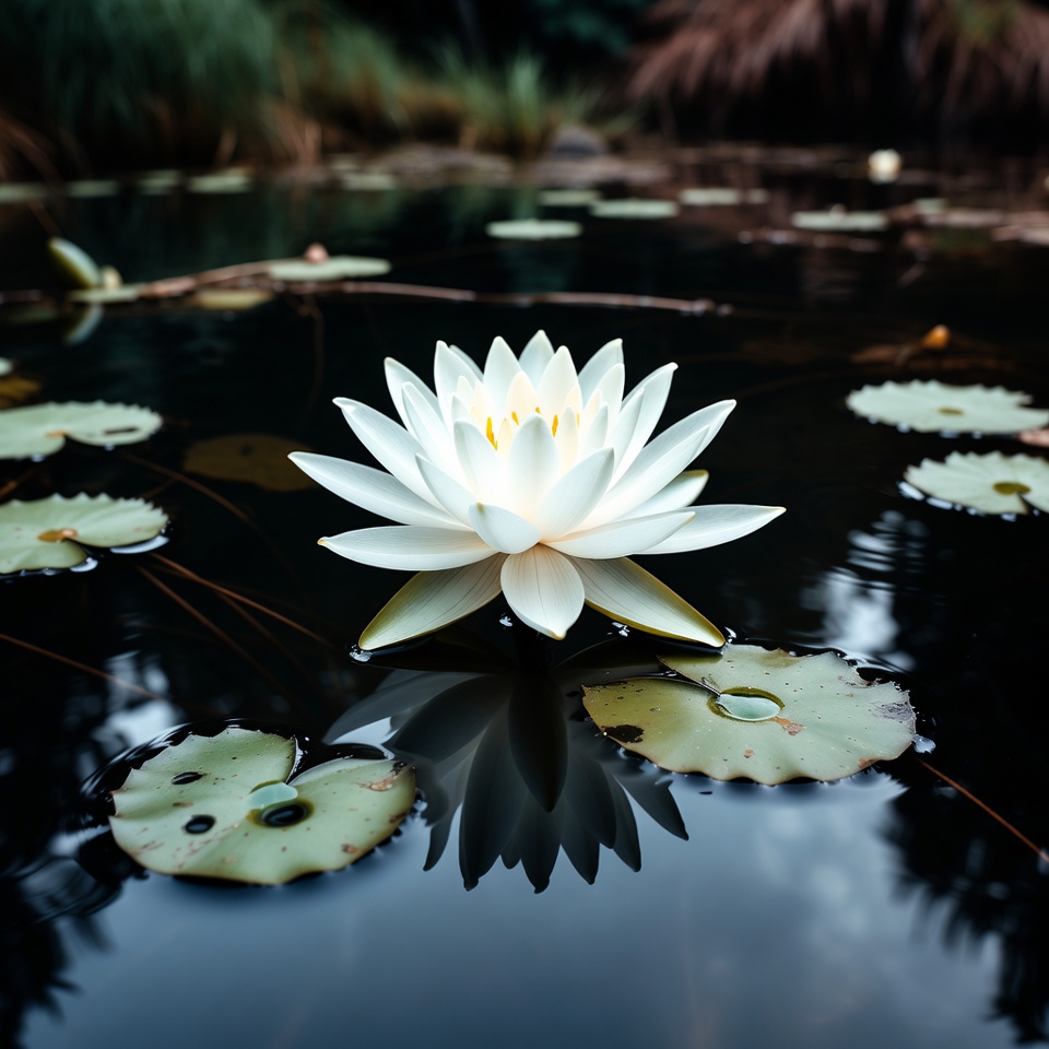 aquatic plant, bloom, botany, dark water, floating flower, floral, flower, green leaves, green reeds, lily pads, lotus bloom, lotus flower, natural habitat, nature, petals, pond, pond plants, reeds, reflection, serene pond, water, water droplets, water lily, water surface, white flower, white lotus
