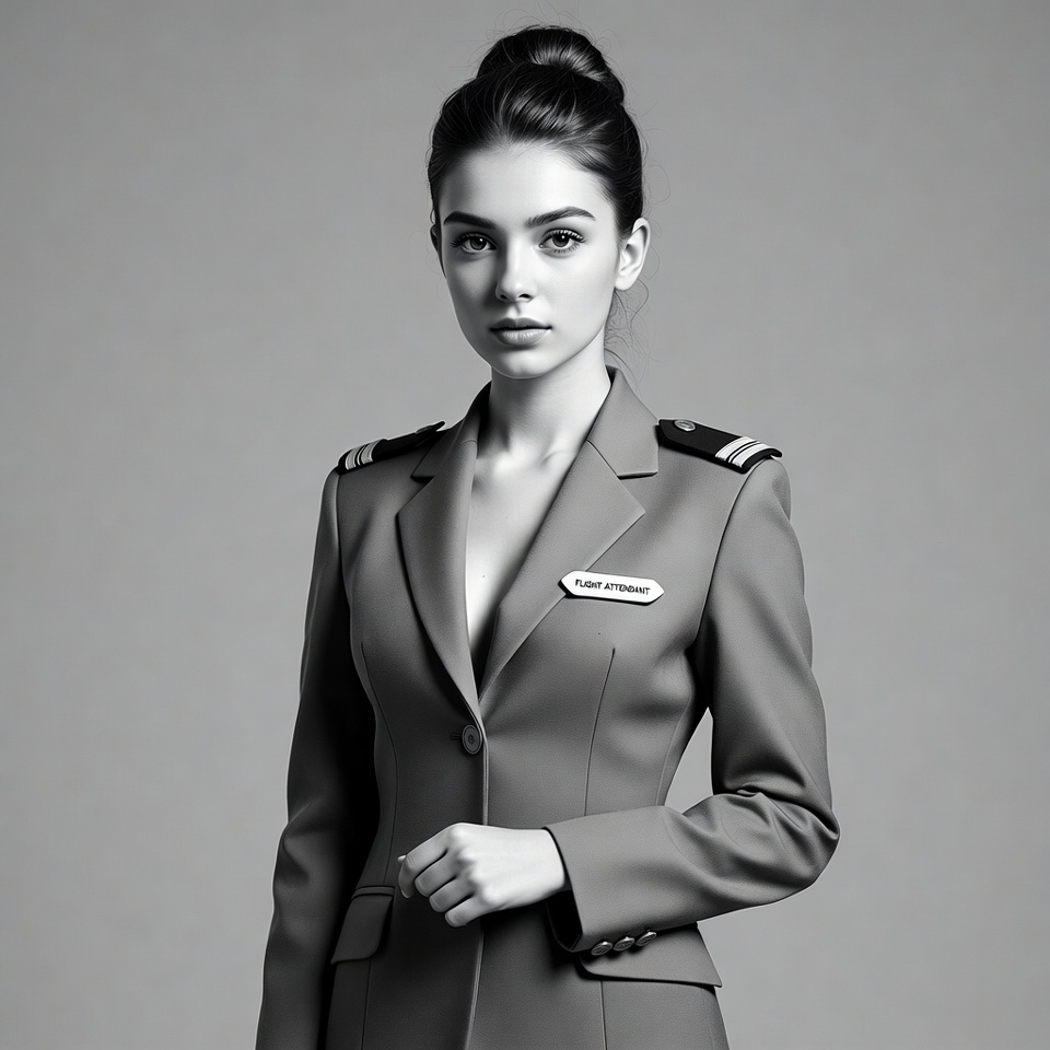 aviation, beautiful, black and white, bun hairstyle, cleavage, confident pose, dark hair, epaulets, female, flight attendant, gray background, gray suit, name badge, portrait, professional, stewardess, studio shot, uniform, young woman, woman