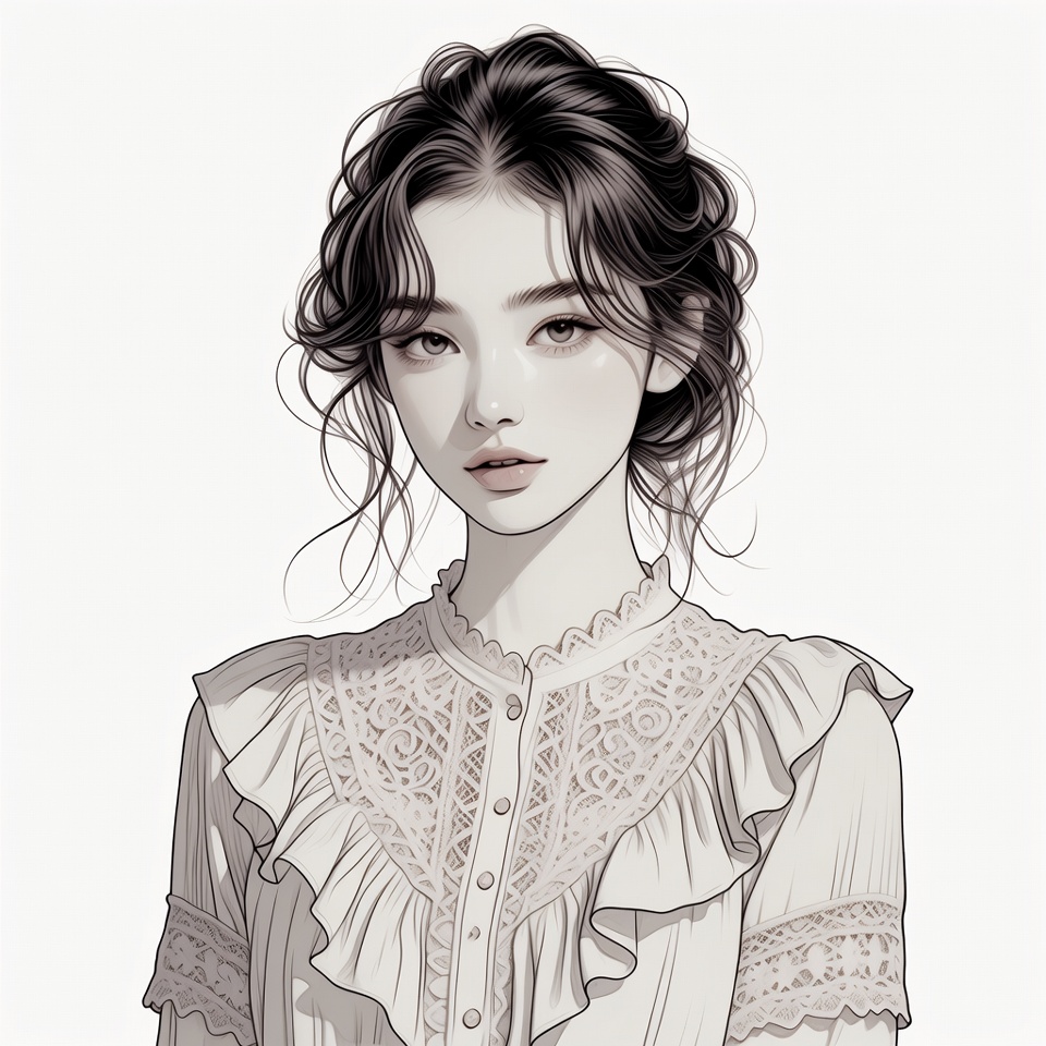A young Asian woman with long dark hair styled in a loose updo gazes forward. She wears a white Victorian-style blouse featuring intricate lace collar and ruffled edges. The portrait is rendered in a detailed digital illustration style on an isolated white background.