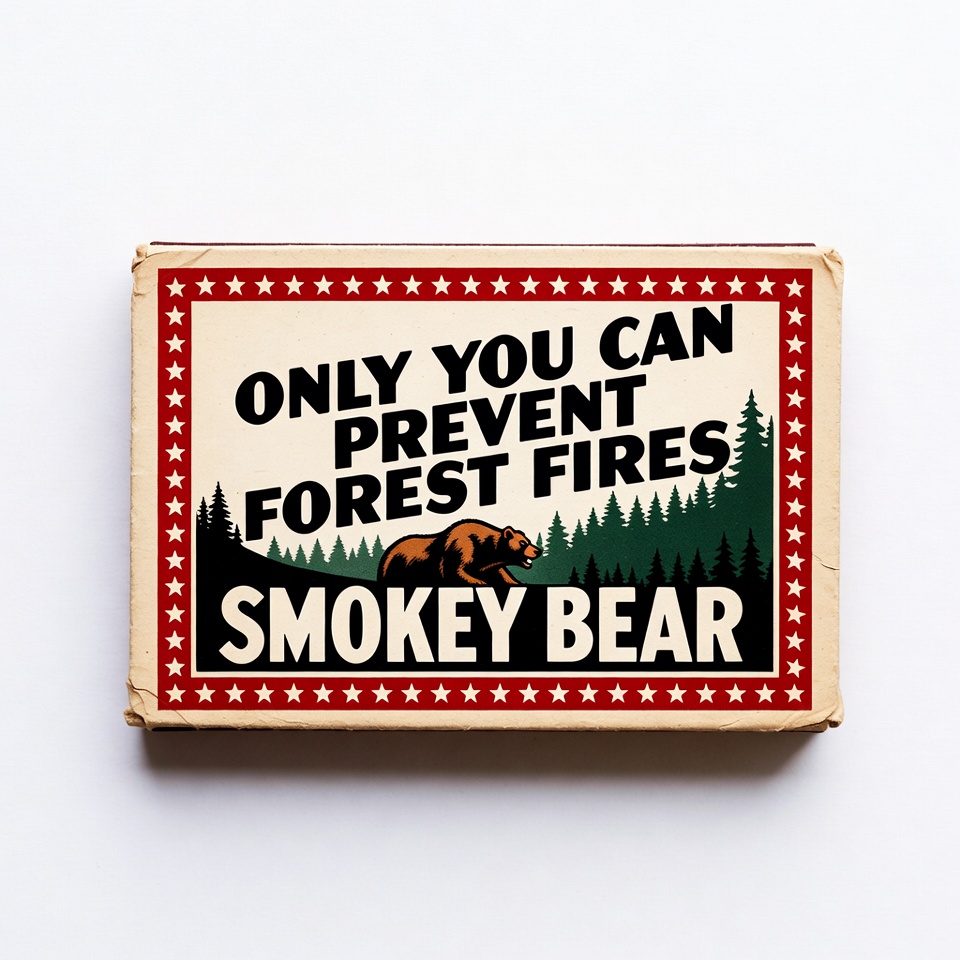 PSA poster, Smokey the Bear, bear, cartoon bear, conservation, fire safety, forest, forest fires, graphic art, illustration, match box, matchbox, pine trees, prevention, ranger hat, red border, retro design, vintage, white background, wildlife, Smokey Bear
