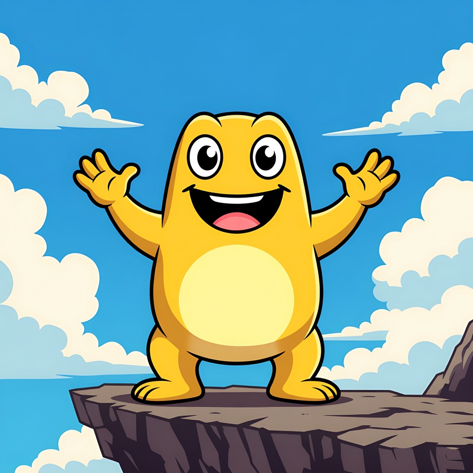 A cheerful cartoon yellow frog with big eyes and wide smile stands on a rocky cliff edge. It raises its arms excitedly against a bright blue sky with fluffy white clouds. The illustration features a vibrant, isolated background.