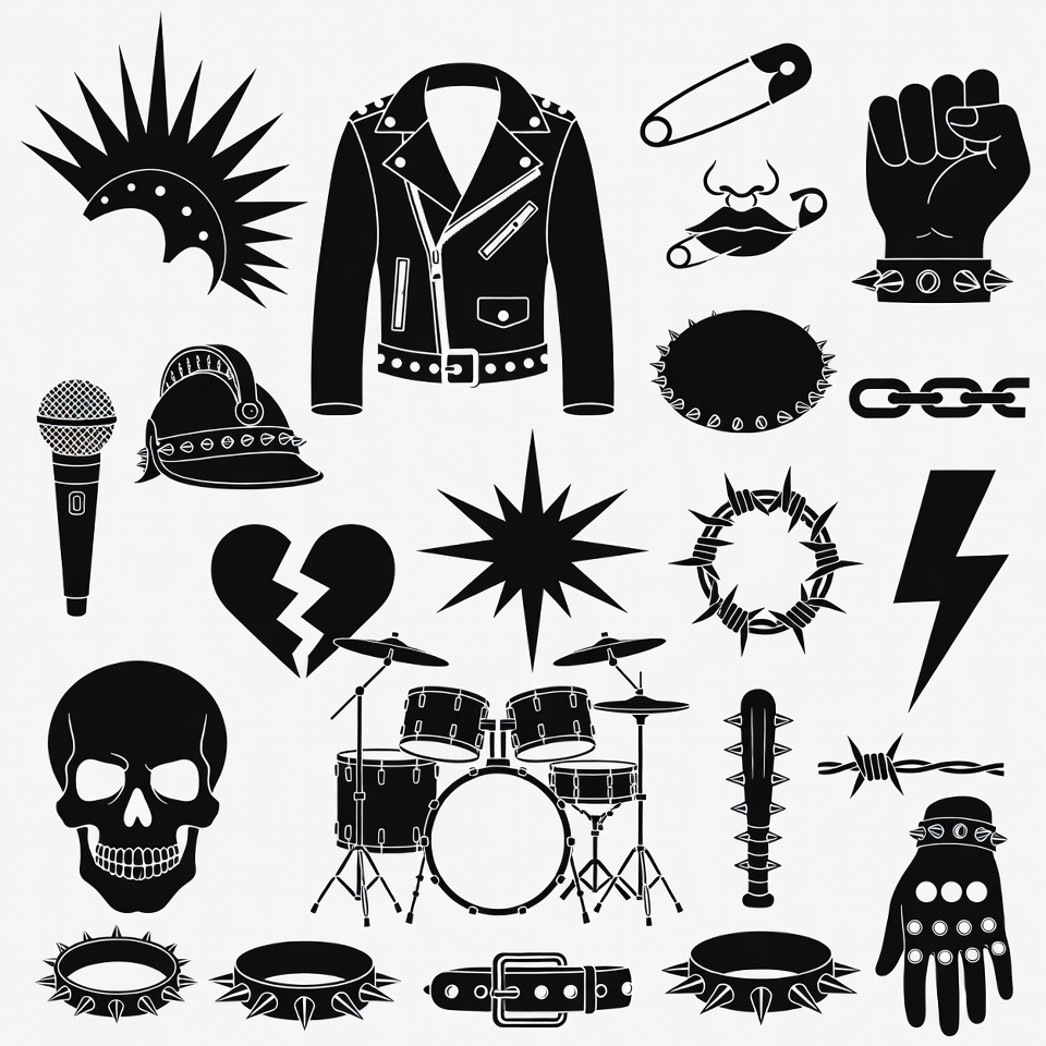 barbed wire, black white, bracelet, broken heart, chains, clipart, drum set, drumsticks, icons, illustration, isolated background, leather jacket, lightning bolt, microphone, mohawk, raised fist, rebellious, rock music, safety pin, silhouette, skull, spiked hair, spikes, star, studs, vector, punk rock