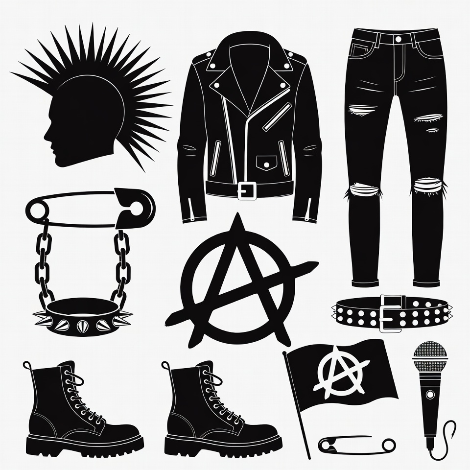 anarchy symbol, black flag, black white, chain, clipart, combat boots, fashion, illustration, isolated background, leather jacket, microphone, mohawk, mohawk hairstyle, punk accessories, punk style, rebellious, ripped jeans, rock, safety pin, silhouette, spiked bracelet, vector icons, punk