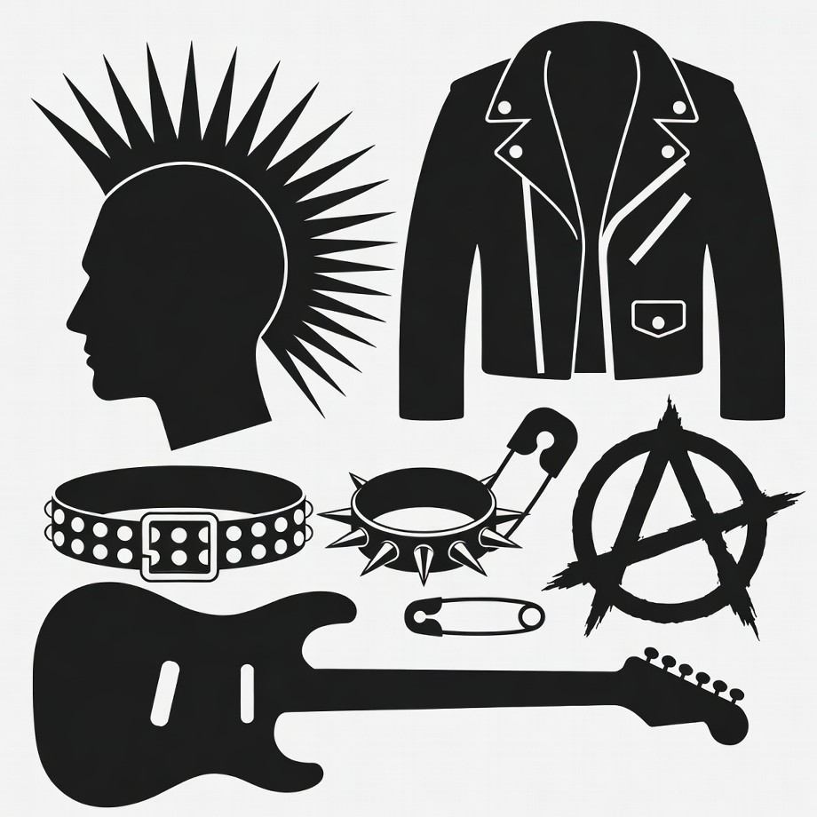 anarchy symbol, black white, clipart, electric guitar, illustration, isolated background, leather jacket, mohawk, profile head, rebellious, rock, safety pin, silhouette, spiked collar, spiky hair, studs, subculture, punk