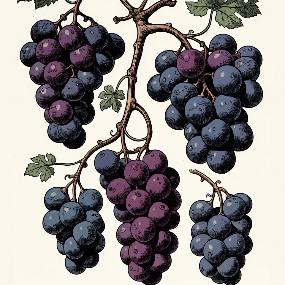 An illustration of ripe purple grapes hanging in clusters from a woody vine branch. Green leaves are attached to the stem, and the grapes display shades of deep purple and blue. The image is rendered in a detailed line drawing style on a white background.