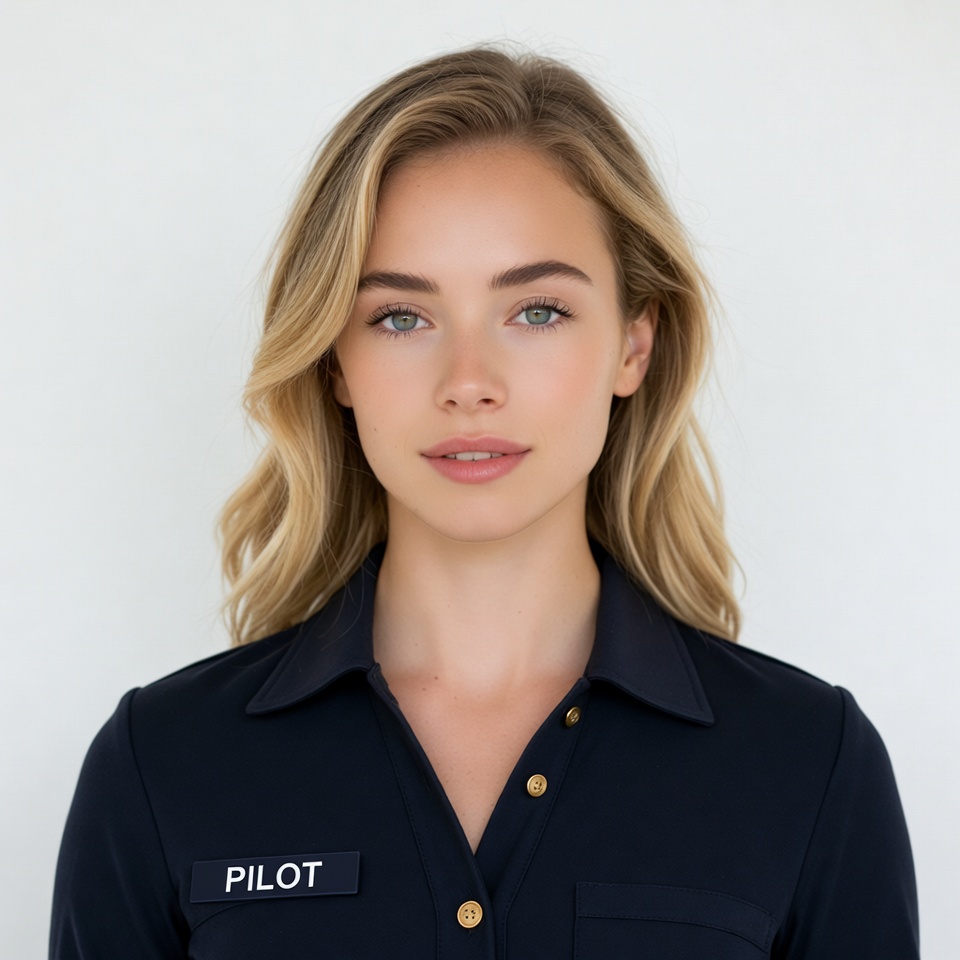 A young woman with long blonde wavy hair stands smiling at the camera against a white background. She wears a navy blue pilot uniform shirt with gold buttons and a white 'PILOT' name badge on her chest. Her green eyes and subtle makeup enhance her professional appearance.