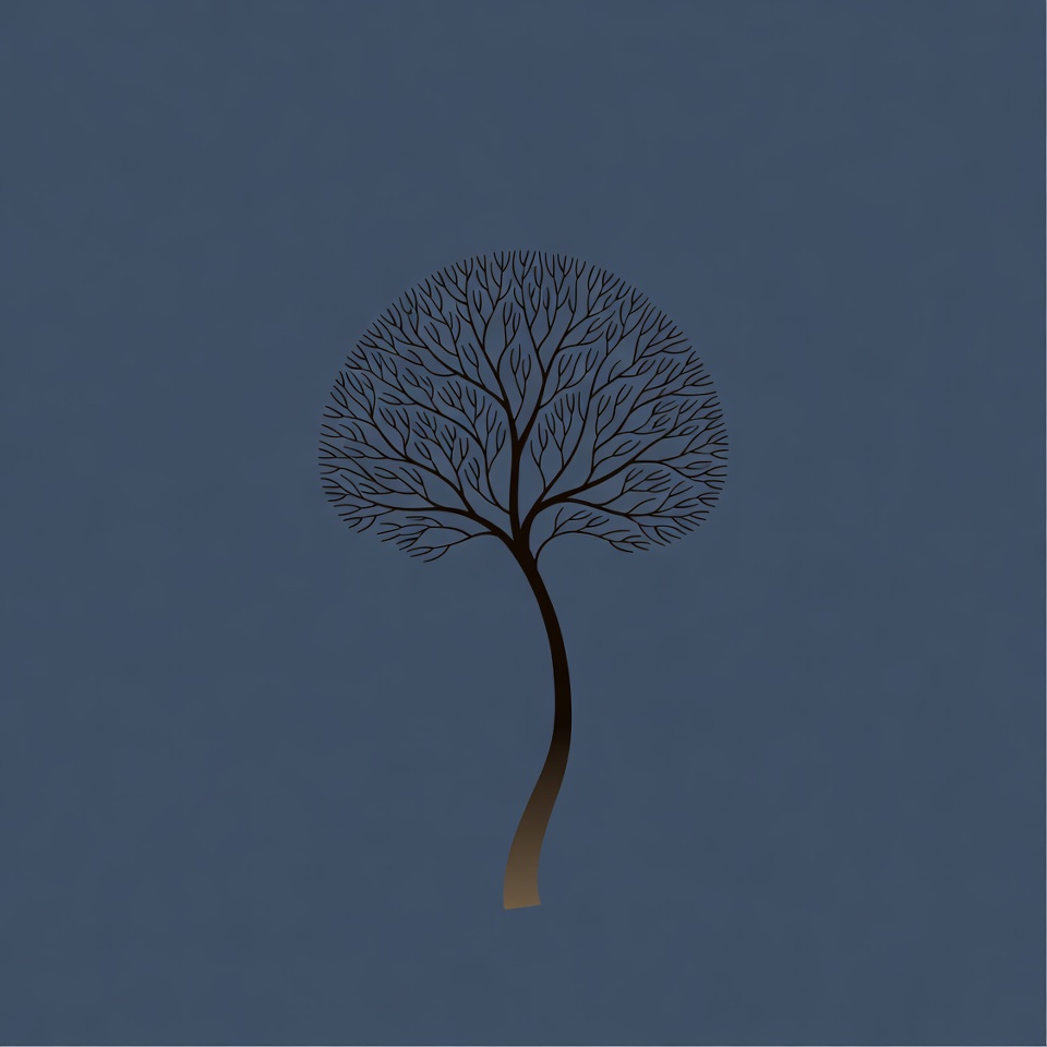A minimalist black tree silhouette stands against a solid navy blue background. The tree features intricate branching details in its rounded canopy and curved trunk. It appears as a simple vector illustration with no additional elements.