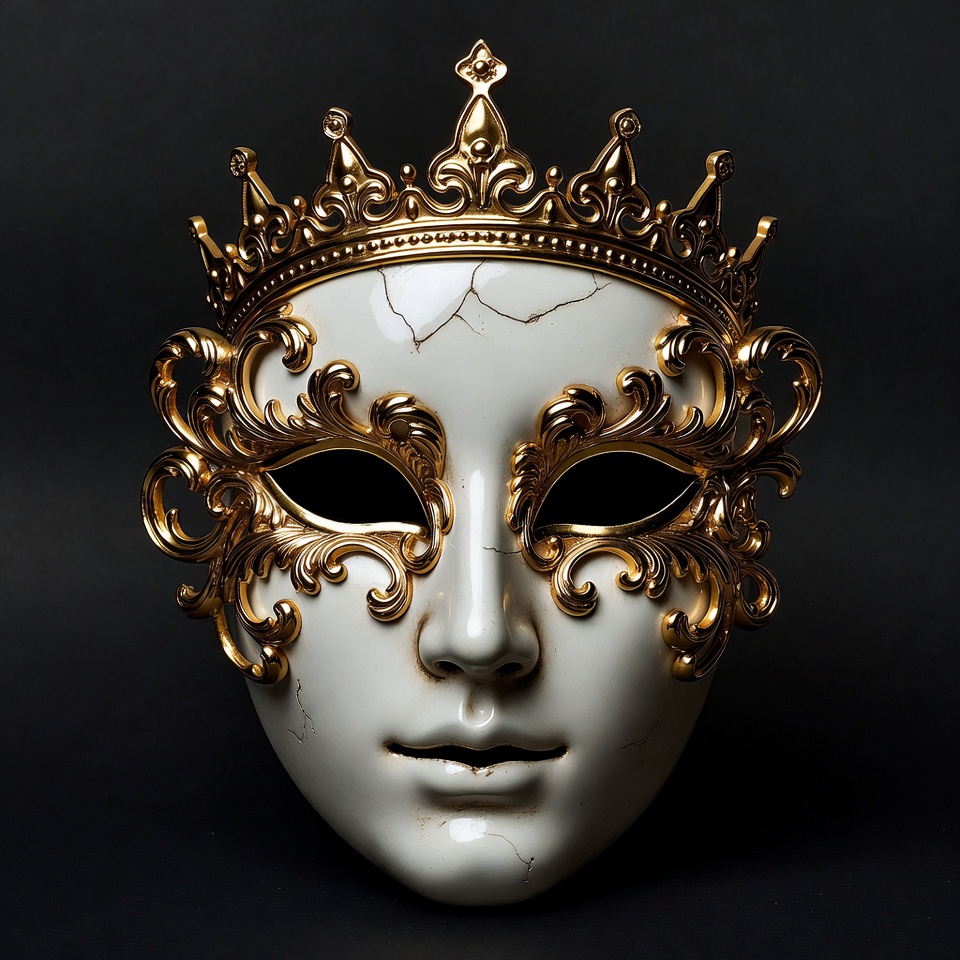 Venetian mask, artistic mask, black background, carnival mask, costume accessory, cracked porcelain, crown top, decorative mask, elegant mask, face mask, filigree design, gold filigree, gold mask, intricate design, luxury mask, masquerade ball, ornate mask, porcelain mask, white mask, masquerade mask
