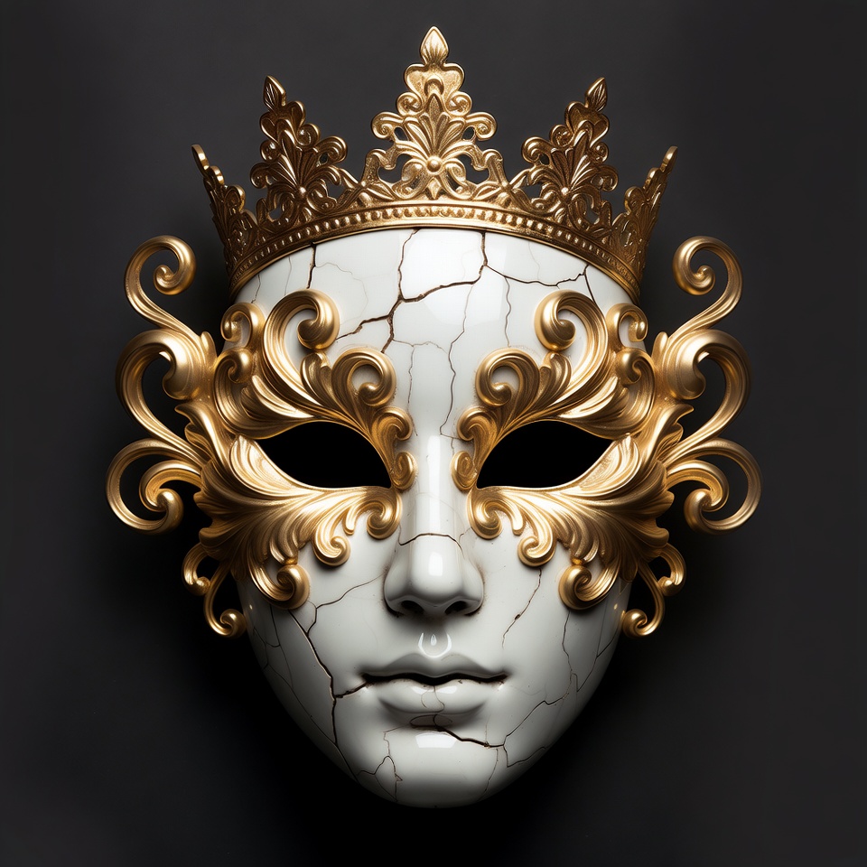 artistic mask, baroque mask, black background, carnival mask, costume mask, cracked mask, crown mask, decorative mask, elegant mask, face mask, fancy mask, gold filigree, gold mask, isolated background, luxury mask, masquerade mask, ornate mask, party mask, rococo design, theater mask, venetian mask, white porcelain, mask