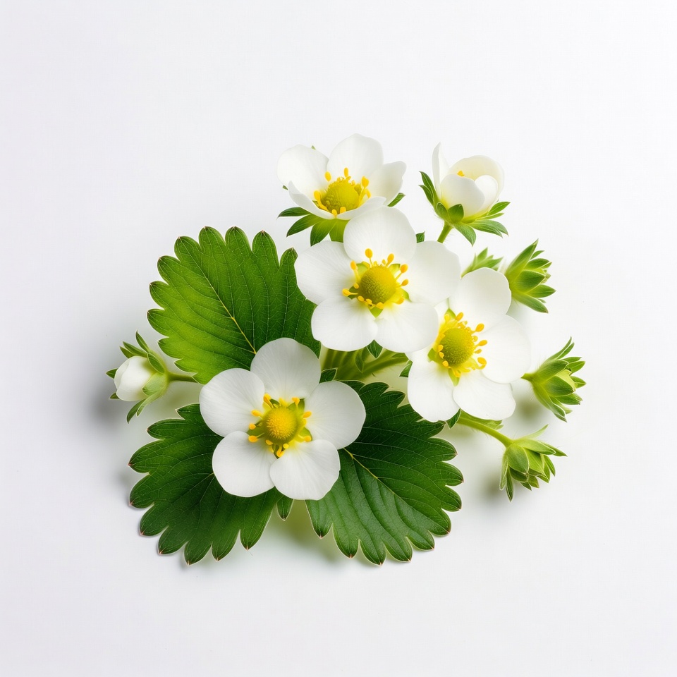A cluster of delicate white strawberry flowers with yellow centers is arranged with green serrated leaves. The flowers and leaves are positioned on a plain white background, isolated for clarity. Several buds and small stems add detail to the composition.