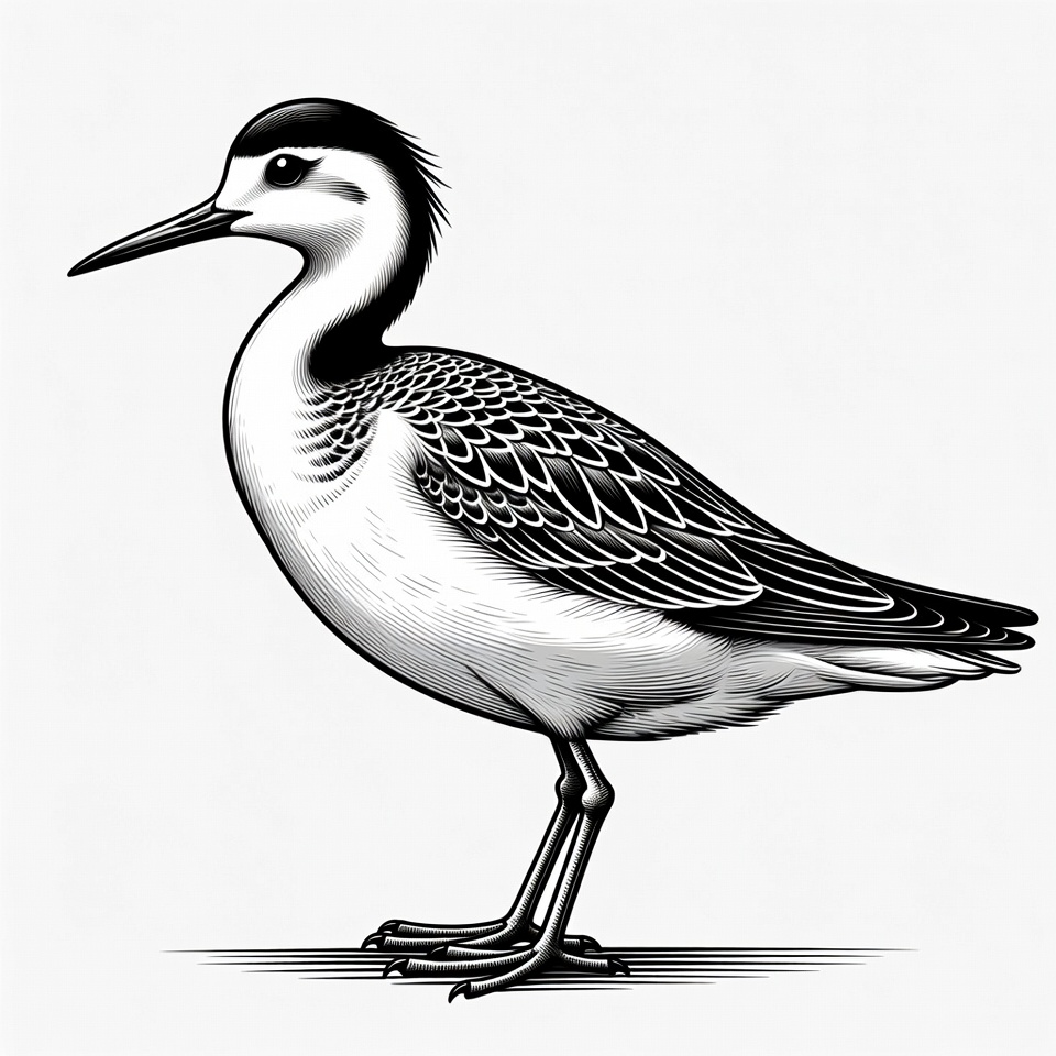 animal, bird, black and white, black cap, engraving, feathers, illustration, isolated background, line art, long bill, one leg, shorebird, side view, standing, stilt bird, vector art, wading bird, white plumage, wildlife art, black-necked stilt